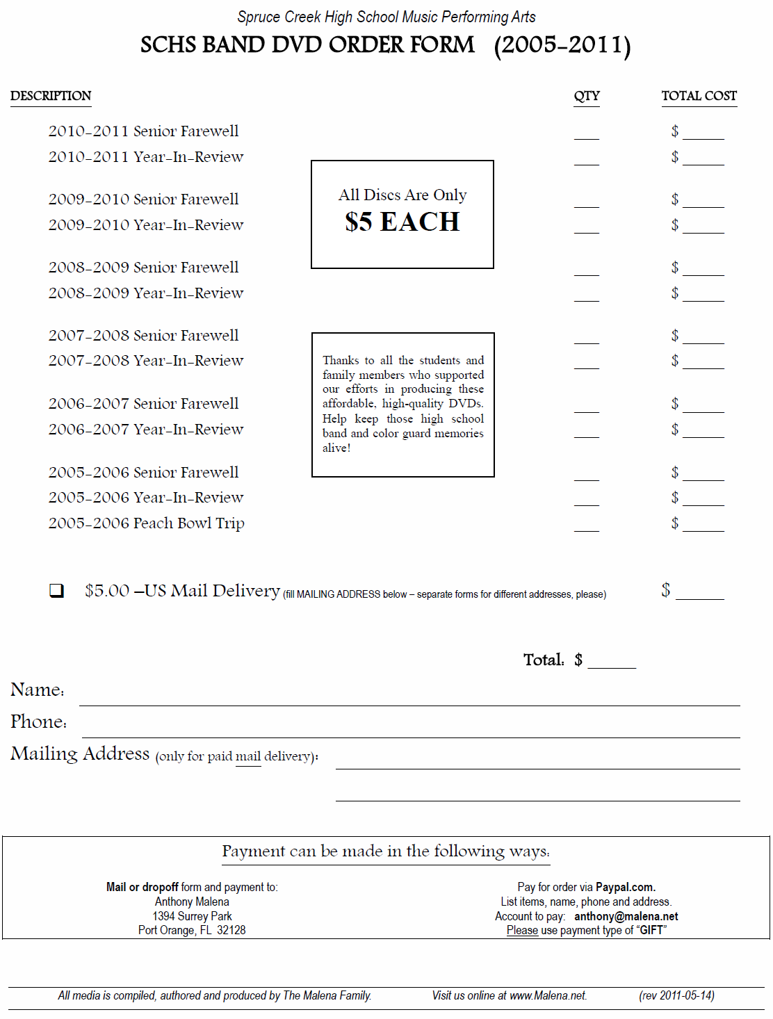Spruce Creek High School Musical Performing Arts DVD Order Forms (2005-2011) Click here to open and print the order form. (Acrobat) (or, click here for an alternate link) (PNG Graphic File) |